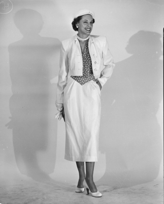 For sightseeing at Galveston or Acapulco, Icybelle Richardson wears a white pique bolero suit with red poka dot silk halter blouse. Published in Fort Worth Star-Telegram morning edition, May 28, 1950.