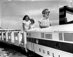 "Engineer" Steven Pope, son of Mr. and Mrs. Louis T. Pope, 3124 Bristol Rd., tries out the train at the Bowie Boulevard Kiddie Playland, which Interstate Theaters opened at 7100 Camp Bowie Blvd. Enthusiastic passengers are Patte, left, and Eileen Sheridan, daughters of Sgt. and Mrs. R. P. Sheridan, 3113 Sondra Dr. Published in Fort Worth Star-Telegram morning edition May 9, 1954.
