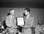 G. B. Trimble, left, principal of Technical High School, accepts a plaque from Robert M. McAbee, president of the Business and Industrial Education Club. The club honored Trimble Wednesday for his 28 years of work in vocational education and for his direction of vocational education in Fort Worth public schools. Published in Fort Worth Star-Telegram morning edition May 5, 1954.