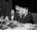 Members of Ridglea Presbyterian Church opened a financial drive Wednesday night to expand facilities. Prominent on the loyalty dinner program are, left to right, Reverend Clifford W. Williams, minister, Don Kirk, master of ceremonies, and A. M. Pate Jr., general campaign chairman. Published in Fort Worth Star-Telegram morning edition May 5, 1954.