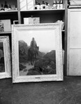 Copies of paintings. A framed painting in a storage room resting on shelves of someone on a horse riding. There are rocks on both sides with a path in the middle. The person back view of the person is what is painted.