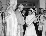 St. Joseph's Hospital Nurses Home. Most Reverend Thomas K. Gorman, Amon Carter and Mary Vicari of Montague, president of the St. Joseph's School of Nursing. Mary is holding a framed photograph and is showing it to Mr. Carter, the Reverend and some other unidentified people. There are other people in the background present and observing the event. Mary is wearing a nurse uniform, Mr. Carter is wearing a suit and tie and the reverend is also in his uniform.