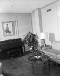 St. Joseph's Hospital Nurses Home. In the photograph, there is a sofa close to the wall and a table with a lamp on the side. There is a also a circular center table with a potted plant and a piano with a framed painting of the lady on a wall above it.