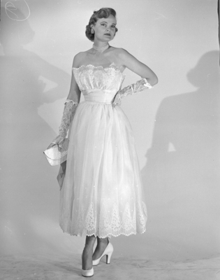 For a stay-at-home vacation Maxine Reardon models a floaty white organdy over pale yellow taffeta by Emily Wilkins for country club dances. Published in Fort Worth Star-Telegram morning edition, May 28, 1950.