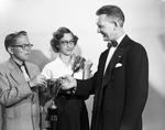 Joe Healy, left, of St. Thomas Catholic School and Mary Margaret Hoch of St. Mary's Catholic School accepted gold loving cups for their work at schools in the Green Cross for Safety Flag program. Published in Fort Worth Star-Telegram morning edition May 6, 1954.