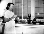 Hospitals opened their laboratories to visitors to give the public a better idea of what a medical technologist does. Here Mrs. Anne Looney, technologist at Saint Joseph's, is weighting out a powder to make up a solution for a hemoglobin test. Published in Fort Worth Star-Telegram morning edition May 9, 1954.
