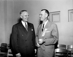 Federal Judge Luther W. Youngdahl of Washington, D. C., left, chats with Reverend W. A. Welsh, Dallas, at the first general session of the Christian Church's 67th annual convention here. Reverend Mr. Welsh is convention president. Published in Fort Worth Star-Telegram morning edition May 9, 1954.