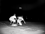 Donald Blasingame of the Buffs beats the ball (right) back to the bag to prevent a double play by the Cats in the first inning of the Houston-Fort Worth game at La Grave. Wally Fiala, Cat first baseman, is set for the throw, after an infield fly. Published in Fort Worth Star-Telegram morning edition May 9, 1954.