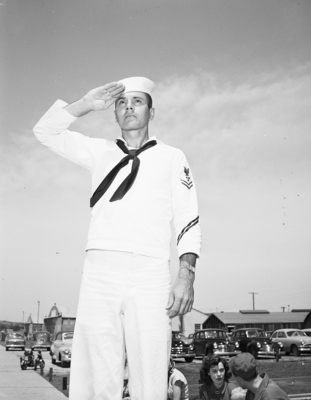 Scenes of the first Armed Forces Day celebration staged at Carswell Air Base were caught by Joe McAulay, Star-Telegram cameraman, as the image of K. H. Robinson, 116 South Lake, Boiler technician first class in the Naval Reserve and a veteran of six years of war duty in the Pacific, snapped to salute the passing colors. Published in Fort Worth Star-Telegram morning edition May 21, 1950.