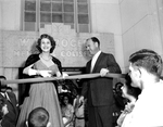 Arlene Francis, star of NBC television's "Home" show, prepares to cut the ribbon which opened the Star-Telegram's Home Show. Amon Carter Jr. joined the actress in welcoming visitors to the exhibits at Will Rogers Memorial Coliseum. Published in Fort Worth Star-Telegram morning edition May 10, 1954.