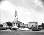 Texas Christian University's Religion Center was dedicated during an open air program on the lawn. Hundreds of persons sat in folding chairs during to hear Dr. A. Dale Fiers of Indianapolis and to see the university award 12 honorary doctor's degrees. The building's three divisions, centered by Robert Carr Chapel, are pictured. Published in Fort Worth Star-Telegram morning edition May 10, 1954.