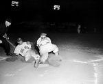 The Cat's Jim Bragan is tagged on the play by Houston's Dick Rand to complete a double play in the second inning of the game at La Grave Field. Bragan is trying to score from third base on an infield out, but Ed Marolewski's throw nips him. The umpire is Bob Smith. Published in Fort Worth Star-Telegram evening edition May 7, 1954.