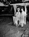 Arlene Francis interviews golfer Ben Hogan before the wishing well in Western Hills Hotel's patio amid the rain during the telecast of the NBC-TV "Home" show. Published in Fort Worth Star-Telegram morning edition May 11, 1954.