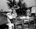 Walter Jetton demonstrates his famous barbecue sauce recipe for Arlene Francis on the rain-drenched patio of Western Hills Hotel during the national telecast of "Home." Published in Fort Worth Star-Telegram evening edition May 10, 1954.