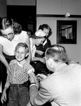 Reaction was varied in Fort Worth schools as second graders lined up for Salk vaccine inoculations in a nationwide experiment to find a successful polio preventive. Here it is shown Donnie Gene Richardson, 8, son of Mr. and Mrs. Homer Richardson of 606 West Bluff who let out a soft "gee" when he took the needle. Published in Fort Worth Star-Telegram evening edition May 11, 1954. The woemn in the photo are unidentified.