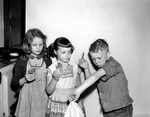 Tim Watson, 1808 Junius, shows two classmates at Meadowbrook School, Letitia Strickland, 4013 Medford Rd., and Susan Warriner, 1725 Martel, the spot where he received his injection of polio vaccine. The three youngsters were among 73 second graders receiving the polio shots and lollipops, at Meadowbrook. Published in Fort Worth Star-Telegram morning edition May 12, 1954.
