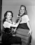 Sylvia Fox, right, was one of more than 500 Fort Worth Blue Birds who were going into Camp Fire Girls. Janice Stapp is shown tying Sylvia's red Camp Fire scarf. Sylvia was the daughter of Mr. and Mrs. Leo C. Fox of 3032 Hanger and Janice was the daughter of Mr. and Mrs. Bernard Stapp of 2725 Quinn. Published in Fort Worth Star-Telegram evening edition May 14, 1954.