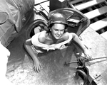 Thousands of civilians swarmed over Carswell Air Force Base to look at equipment on display for Armed Services Day. In photo, Miss Janet Eldred of 6344 Locke climbs through the hatch of a tank of the 49th Armored Division. Published in Fort Worth Star-Telegram morning edition May 16, 1954.