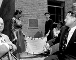 Daughters of Major K. M. Van Zandt unveil a plaque at dedication of the Memorial Armory at 2800 Crestline Road. They are, left, Mrs. Clarence Sloan and Mrs. W. A. Diball, right. Looking on are Colonel John Samuel, Carswell Air Force Base commander, next to Mrs. Diball, and Congressman Lucas. Published in Fort Worth Star-Telegram morning edition May 16, 1954.