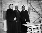 Reverend Flynn V. Long, left, executive secretary of the Mid-Texas Presbytery, assists in laying the cornerstone at the new St. Peter Presbyterian Church with Edward Loving, center, church elder, and Reverend J. S. C. Grattan, church pastor. Published in Fort Worth Star-Telegram morning edition May 17, 1954.