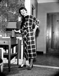 A silky plaid, autumn-like in its beige, brown and black coloring but light enough to wear almost 12 months a year, is one of a collection of fall cottons being shown by Mrs. Mort at Fort Worth Fashion Market in Hotel Texas. Published in Fort Worth Star-Telegram evening edition May 18, 1954.