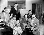 Preparing to appear on a "Search for Happiness" program are, left to right, Dr. Edgar S. Ezell, Dr. J. A. Hallmark, Reverend James Ansley, Mrs. Mary Ruth Strube, Mrs. J. H. Van Zant and Dr. Bruce H. Beard. Published in Fort Worth Star-Telegram evening edition May 19, 1954.