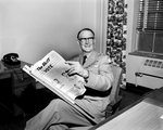 Major General Charles W. Christenberry, one-time catcher and outfielder for the Texas Christian University (TCU) Horned Frogs, examines some of the changes made in the Skiff, the university's newspaper, since he was its editor. Published in Fort Worth Star-Telegram morning edition May 19, 1954.