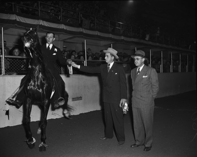 Rita Lee Rose, 6-year-old mare owned by Campbell Sewall of Houston, was crowned champion saddle bred horse of the Southwestern Exposition and Fat Stock Show. George Roberts Jr., rider receives ribbon from Jim Shaver, assistant horse show manager, while Thomas S. McCray of Grove City, Ohio, the judge stands on the right.