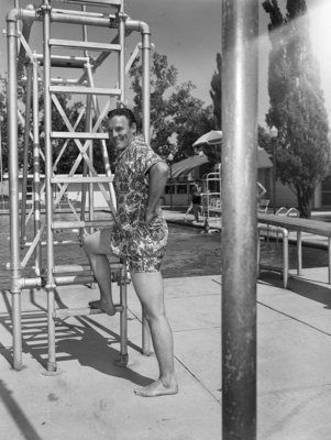 Image of Bob Hunter, 3529 W. Seventh, is getting ready for a high dive while modeling a Hawaiian print swimming trunks and matching short-sleeved sport shirt. Published in Fort Worth Star-Telegram morning edition May 28, 1950.