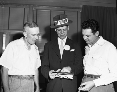 The economic picture of West Texas absorbs the interest of, left to right, Mayor Walter Harwell of Monahans, who is talking with W. H. Peterson of the Fort Worth National Bank, and E. L. Kent, president of the Monahans Chamber of Commerce on Fort Worth trippers' visit to Monahans. Published in Fort Worth Star-Telegram May 24, 1950.