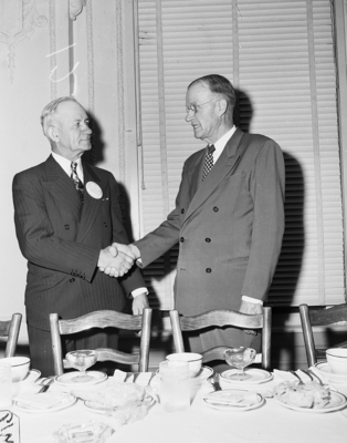 Bailey Powledge, left, of the industrial soap division of Armour & Company, Fort Worth, is greeted by Big Spring Mayor G. W. Dabney at a dinner at the Settles Hotel, Big Spring, for the touring group of Fort Worth business men. Published in Fort Worth Star-Telegram morning edition May 25, 1950