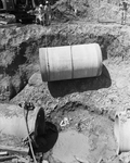 A giant crane lowers this huge section of 72-inch concrete pipe into place for installation in the new raw water conduit from Lake Worth to the city's Holly Plant. The section is scheduled to be sealed into place in the pipe line just west of Rockwood Park Friday morning, completing the big project. Published in Fort Worth Star-Telegram morning edition Jun 4, 1954.