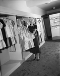 Mrs. Virginia Offutt Retz displays one of the dresses in the stock of her new store, Storktime Maternity Shop, which she opened at 3208 Ridglea. Published in Fort Worth Star-Telegram morning edition Jun 6, 1954.