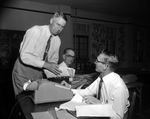 Statistical secretaries to the Central Texas Methodist conference began compiling reports in First Methodist Church of the work of Conference churches during the year which closed May 31. Left to right are Revs. E. D. Piott of Cleburne, R. E. Briggs of Glen Ross and Glenn C. Bowman of Taylor. Published in Fort Worth Star-Telegram morning edition Jun 5, 1954.