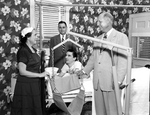Demonstrating a surgical hydraulic lift designed to help paralyzed Harris (Stick) Morris get out of bed for short periods are Mrs. W. L. Leavy, executive secretary of Tarrant County Association for Handicapped, J. J. Baggett, center, incoming vice president, and Gerald C. Wren, incoming president, both of Fort Worth Lion's Club. Published in Fort Worth Star-Telegram evening edition June 10, 1954.