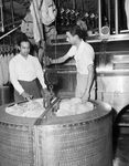 Rusi Deboo, Bombay laundry owner, let, watches as Charles E. Williams demonstrates modern American machinery (an extractor) at the Curran Laundry Company. Published in Fort Worth Star-Telegram evening edition May 25, 1950.