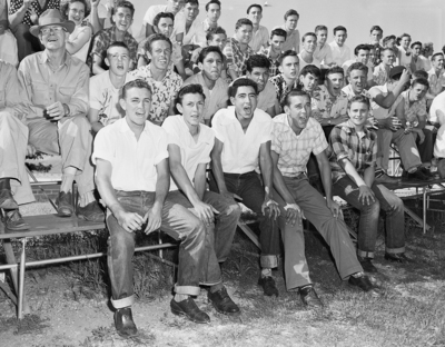 among the loudest rooters for Paschal at Texas Christian University field were these Fort Worth Tech baseball players, who wanted the Panthers to win so that Tech would retain a chance at a place in the state meet. Front row, left to right, are Joe Bill Fox, F. D. Martin, Horace Barbolla and Robert Hawrylak. Back row are Bob Steele, Bobby Hammonds, Amos Urquidi and Rudy Rodriguez. Published in Fort Worth Star-Telegram morning edition May 24, 1950.