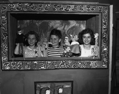 all set for backstage performances manipulating the puppet characters for the annual play of the Fort Worth Children's Museum Puppet Theater at 4:30 are left to right, Jerrie Jo Jennings, Kirkland Connally and Helen Samaras. Published in Fort Worth Star-Telegram morning either May 25, 1950.