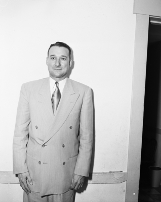 Image of Reverend Alsie H. Carleton at the Northwest Texas conference in Big Spring. He is standing against an open doorway wearing a suit.