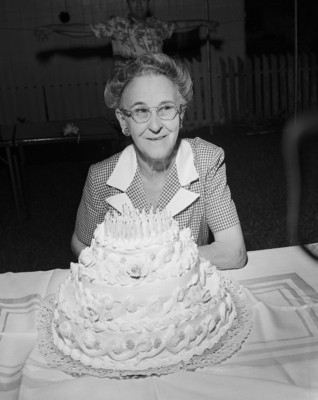 Image of Mrs. H. E. Seyester and her birthday cake. Mrs. Seyester is celebrating her 75th birthday in her garden. The party was attended by several of her friends and twelve of her thirteen children. Published in Fort Worth Star-Telegram morning edition May 24, 1950.