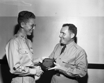 Cadet Lieutenant Colonel Wayne Austin, left, presents a plaque to Captain George H. Gould, ROTC commandant at Technical High School, in appreciation of his three years' service with the cadet corps. Published in Fort Worth Star-Telegram morning edition May 24, 1950.