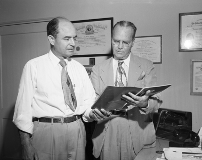 Image of R. W. Brown of Gainesville, left, chairman of the Sweeney Diabetic Foundation, and Dr. J. Shirley Sweeny, after whom the foundation is named, examine a booklet describing Camp Sweeney, a newly-built summer camp near Gainesville for diabetic boys and girls that will open June 12. Published in Fort Worth Star-Telegram morning edition June 1, 1950.
