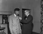 L. R. Riggs, left, brick and stone mason, was honored by architects as the outstanding building craftsman of the year. Edward L. Wilson, president of the Texas Society of the American Institute of Architects, pinned a lapel pin on Riggs during a dinner at River Crest Country Club. Published in Fort Worth Star-Telegram morning edition May 24, 1950.