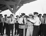 Fort World Patrolman C. M. Leach, left, eyes his target while Air force Technician, Sargeant Petty Officer Blankenship gives Patrolman A. C. Styles some points at the opening of the day-long police pistol shoot at Carswell air Base. Carswell officers were to act as judges. Published in Fort Worth Star-Telegram morning edition May 24, 1950.