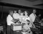 It was family night at LaGrave Field, and among those in attendance was the H. C. Fuller family. Ticket Taker Dewey Kenny collects pasteboards from (left to right) Stephen, 5; Fuller, Paul, 9 months, Mrs. Fuller and David, 8. Published in Fort Worth Star-Telegram morning edition July 13, 1954