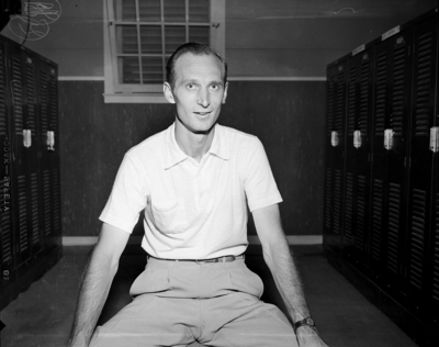 At the $15,000 Colonial National Invitation are 35 golfers who are at hand. They are the country's top-ranking pros and the USGA among which is Dave Douglas, shown sitting on a bench in a locker room. Published in Fort Worth Star-Telegram evening edition, May 25, 1950.