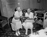 Mrs. G. W. Kent, left, of Lanett, Alabama, listens as Mrs. Emma Searcy of 1009 Cleckler recalls childhood experiences in Alabama. The women are half sisters who saw each other for the first time in 61 years. Published in Fort Worth Star-Telegram morning edition July 19, 1954