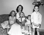 After having lived in New Orleans, Mrs. B. W. Garrison Jr. and children, left to right, June K., 7, John, 1, Jan, 2, and Buzzy, 4, have returned here with Dr. Garrison to live at 2920 Merida. Mrs. Garrison Jr. is the former Miss June Knepper. The image shows the family seated together. Published in Fort Worth Star-Telegram morning edition July 24, 1954