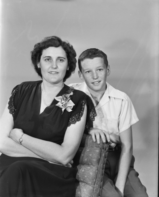 Mrs. Jessie Lee Helton, 103 North Roe, and son, Robert Taylor Helton, will leave with Mr. Floyd E. Helton for a vacation in Miami. Published in Fort Worth Star-Telegram evening edition May 25, 1950. A woman and a young teenage boy.