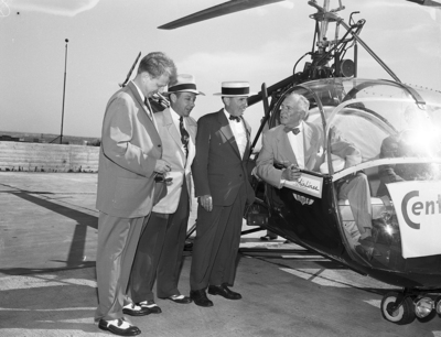 A helicopter whisked W. K. Stripling, department store head, from River Crest golf course to the roof of his firm's downtown parking garage in four minutes. Greeting him, left to right, are Keith Kahle, Central Airlines president; R. E. Harding Jr., Central vice president, and W. C Stripling Jr., brother of the seated helicopter commuter. Published in Fort Worth Star-Telegram evening edition May 24, 1950.